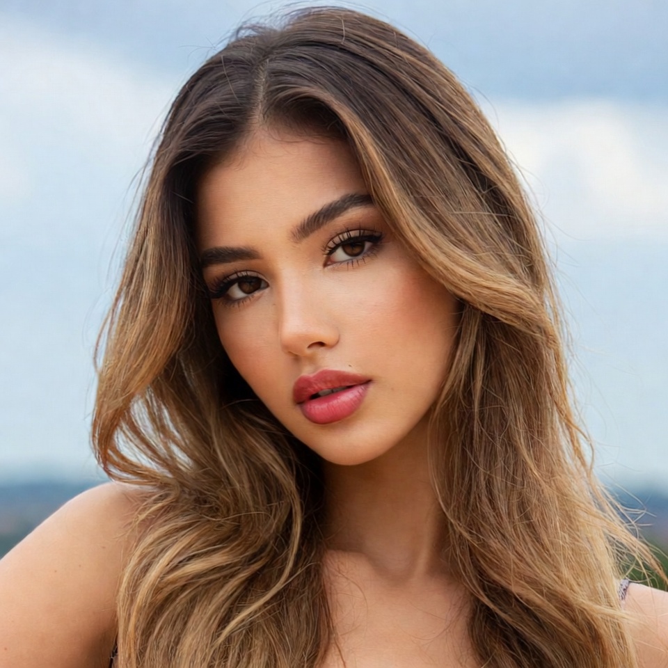 A young woman with long wavy brown hair and highlighted face gazes at the camera. She has full lips with pink lipstick, defined eyeliner, and subtle blush on her cheeks. The background features a soft blue sky.