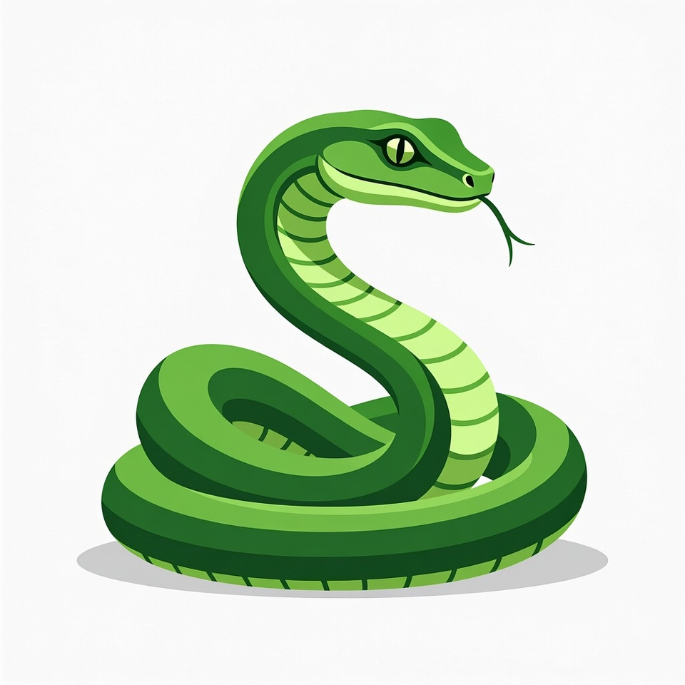 A vibrant green snake coils in an S-shape on a white background. It features detailed yellow eyes, scales, and a small tongue sticking out. The illustration has a cartoonish style with smooth shading.