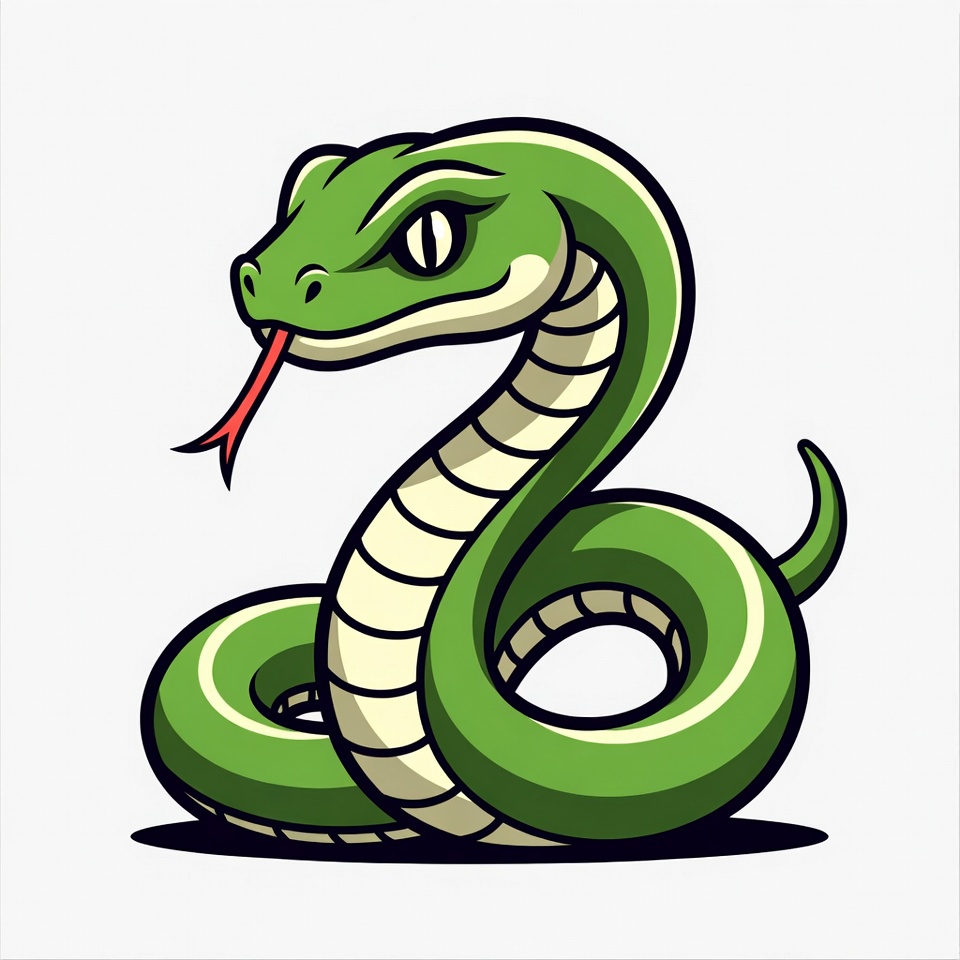 A vibrant green cartoon snake with white underbelly is coiled in an S-shape. It features fierce red eyes, an extended forked tongue, and glossy scales. The illustration is set against a transparent background.