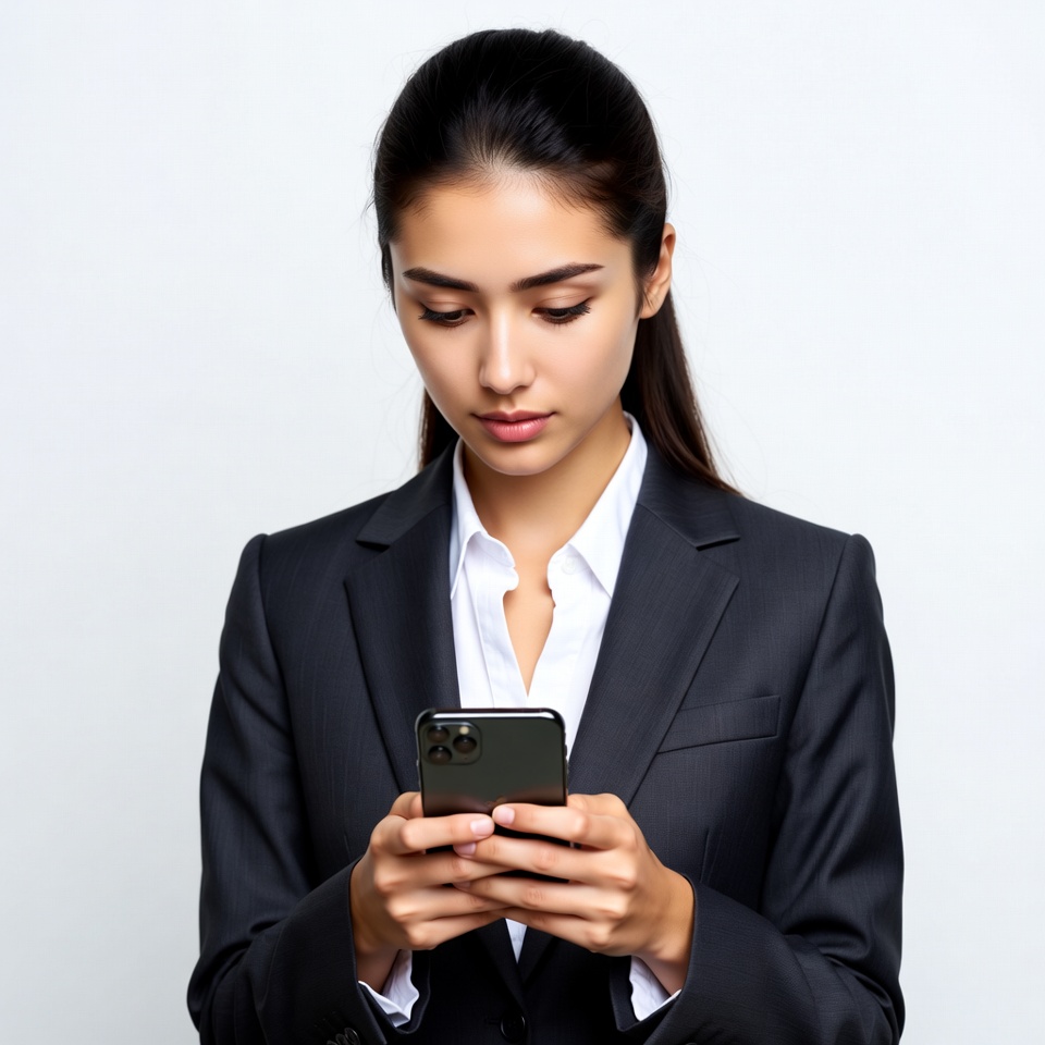A young Asian woman with long dark hair in a ponytail looks down at her smartphone. She wears a black business suit with a white collared shirt and holds the black iPhone with both hands. She stands against a plain white background.