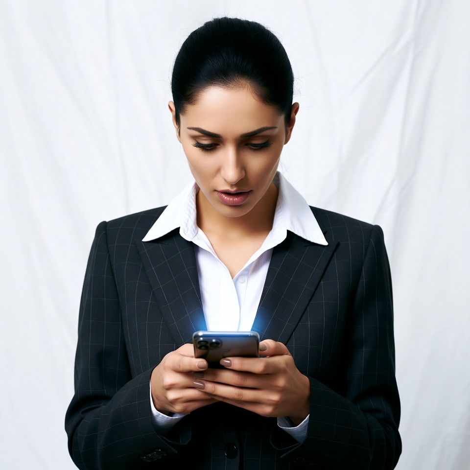 Middle Eastern, black suit, bun hairstyle, businesswoman, cellphone, checking phone, dark hair, female, focused expression, glowing screen, hands holding phone, iPhone, office attire, phone, pinstripe suit, professional, smartphone, suit, texting, white background, white shirt, woman