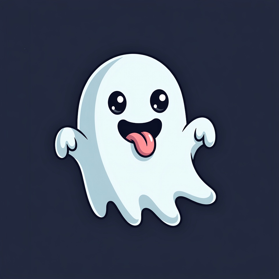 A kawaii-style white ghost illustration with big sparkling eyes and a wide smile floats against a dark background. It sticks out its pink tongue playfully with arms raised. The design features smooth cartoon shading and an isolated transparent appearance.