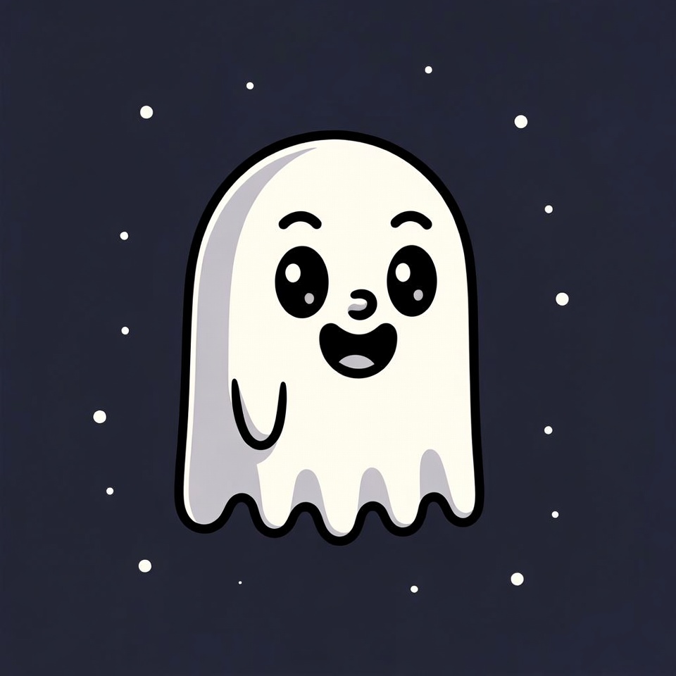 Halloween, animated style, big eyes, cartoon ghost, clipart, cute ghost, dark blue, floating ghost, friendly ghost, illustration, kawaii, smiling ghost, spooky, starry background, white ghost, ghost