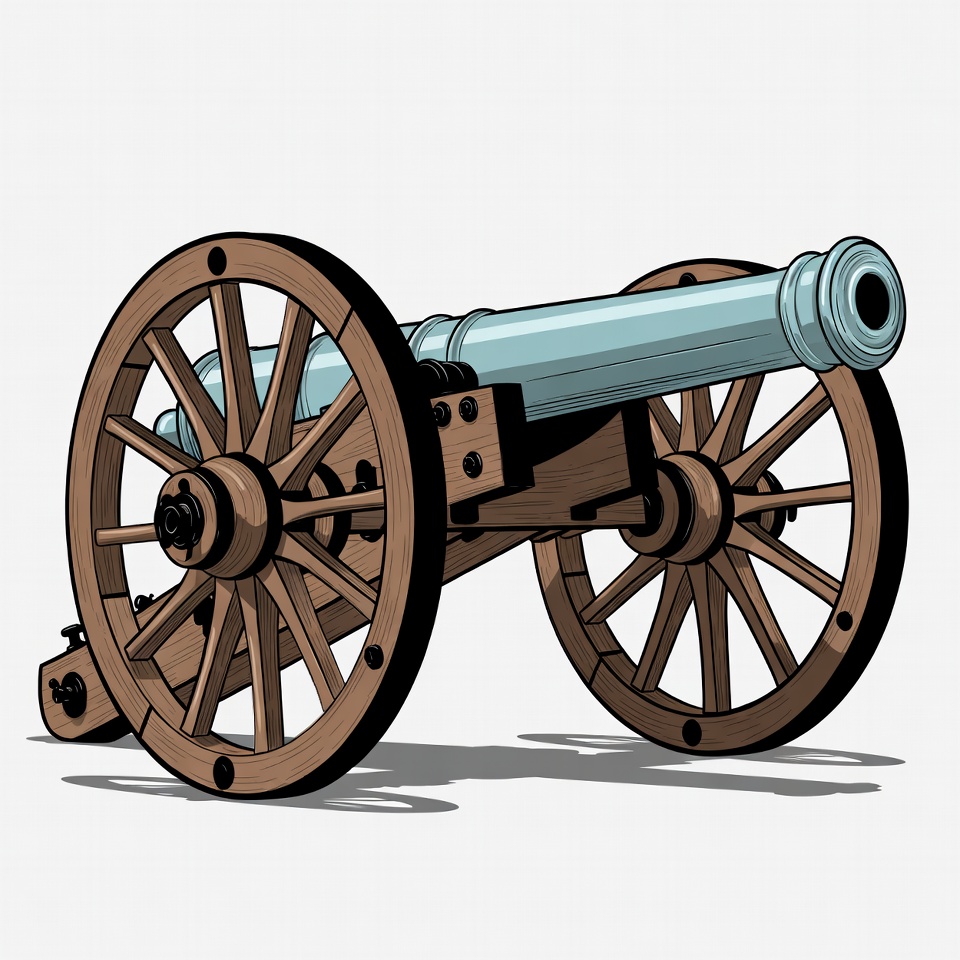 A detailed vector illustration of a historical cannon with a light blue barrel and wooden wheels. The cannon features ornate metal fittings and a sturdy wooden carriage. It is depicted on an isolated white background with subtle shadows.