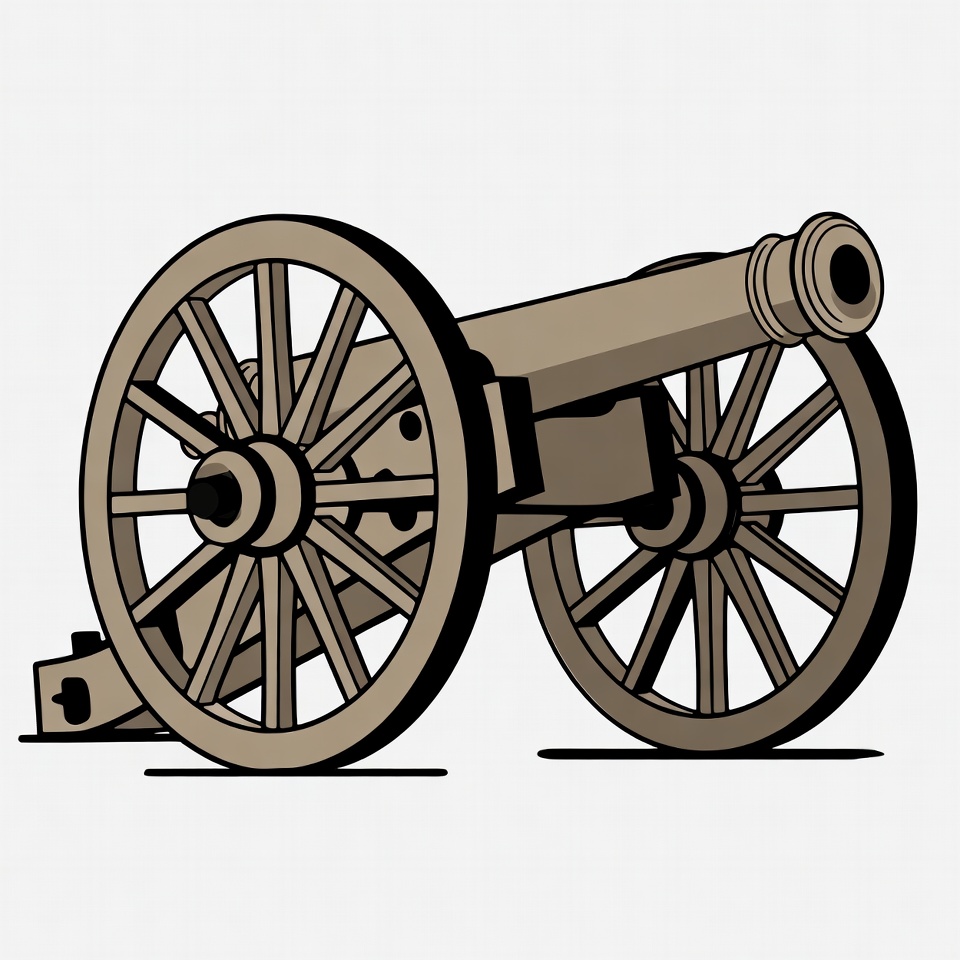 american civil war, artillery, brown color, cartoon, civil war cannon, clipart, gun barrel, historical cannon, history, illustration, isolated background, military weapon, side view, vintage cannon, war, wheels, wooden wheels, cannon