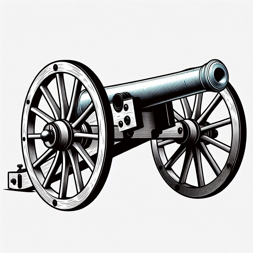 artillery, civil war cannon, clipart, engraving style, firepower, gun, historical weapon, illustration, isolated background, line art, military, old cannon, vintage cannon, wooden wheels, cannon