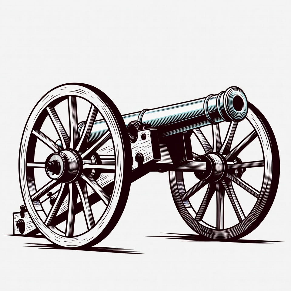 artillery, battlefield cannon, clipart, gun, historical weapon, illustration, ink drawing, isolated background, line art, military, old cannon, vintage cannon, wheels, wooden wheels, cannon