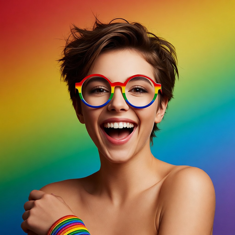 A young woman with short brown hair smiles widely while wearing oversized rainbow-colored glasses. She is topless with shoulders exposed and rainbow bracelets on her wrist. The vibrant rainbow gradient background complements her colorful accessories.