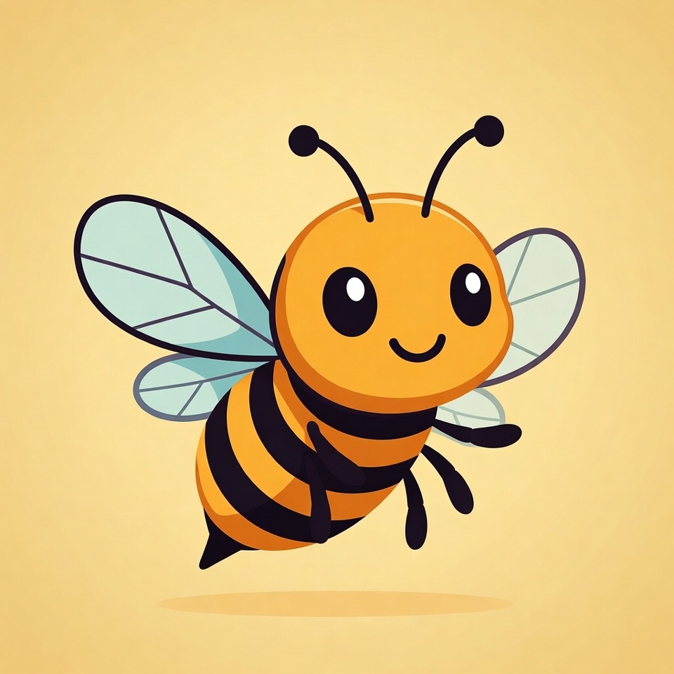 A cheerful cartoon bee with orange and black stripes flies with translucent blue wings spread wide. It has large sparkling eyes, a big smile, and one leg raised playfully. The bee is illustrated on a plain yellow background.