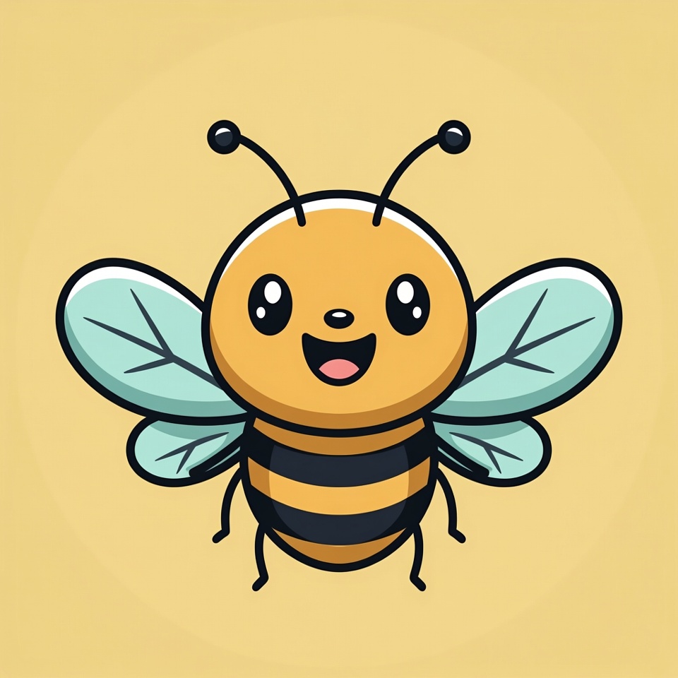 A kawaii-style cartoon bee with yellow and black stripes smiles happily on a plain yellow background. It has large sparkling eyes, antennae, transparent wings, and six legs. The illustration features bold outlines and a cheerful expression.