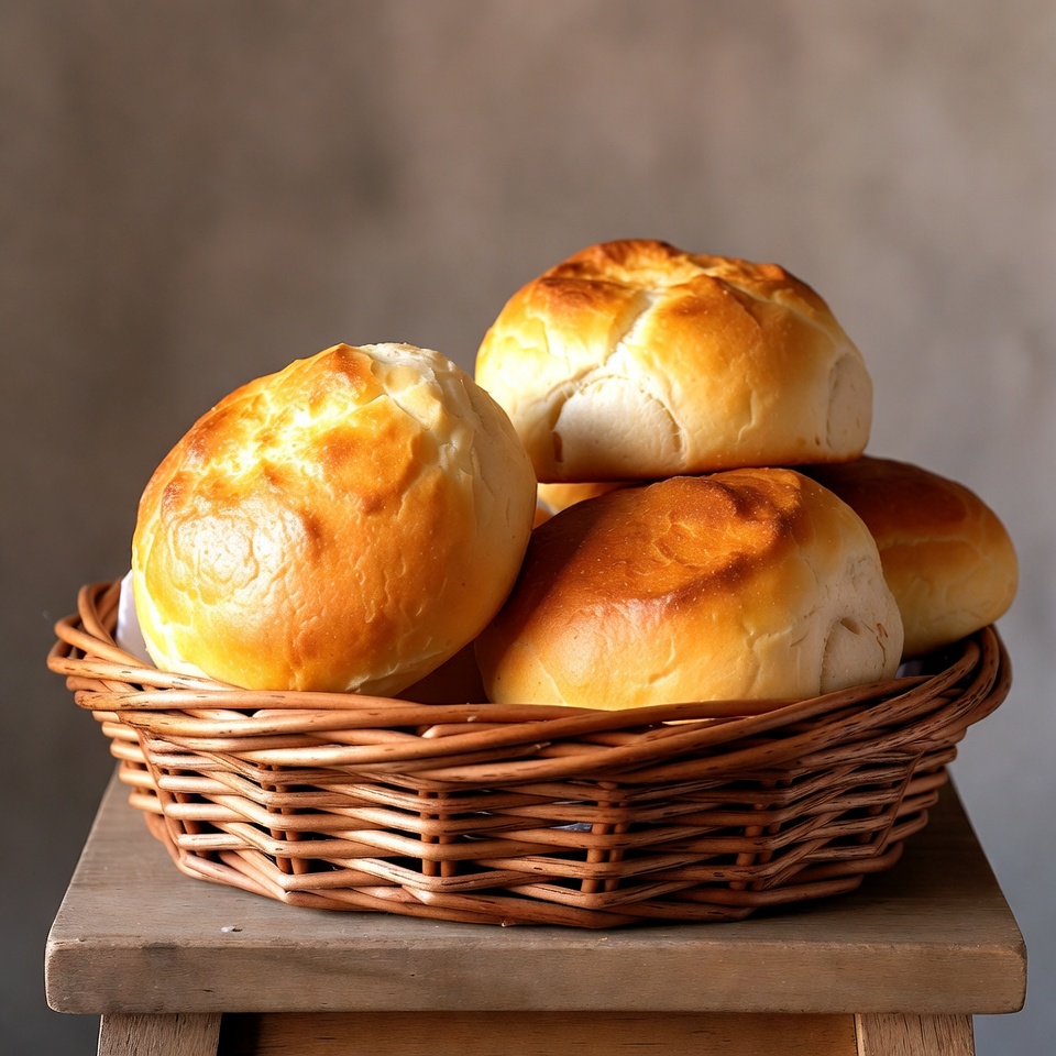 A stack of golden brown bread rolls sits in a woven wicker basket on a wooden surface. The rolls have a shiny, baked crust with soft interiors. The background is a textured beige wall.