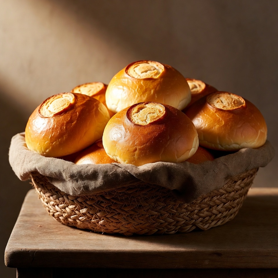 baked goods, bakery, baking, basket of bread, bread, bread basket, cross buns, dinner rolls, dough, food photography, food styling, fresh bread, fresh buns, golden buns, homemade bread, pastries, pile of buns, rolls, rustic basket, shiny crust, still life, warm lighting, wooden table, woven basket, yeast rolls, buns