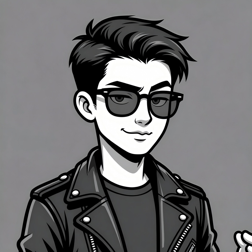 A black and white line art illustration of a young man with short black hair wearing dark sunglasses and a leather jacket over a t-shirt. He has a slight smile and stands against a plain gray background. The style is bold and graphic with thick outlines.