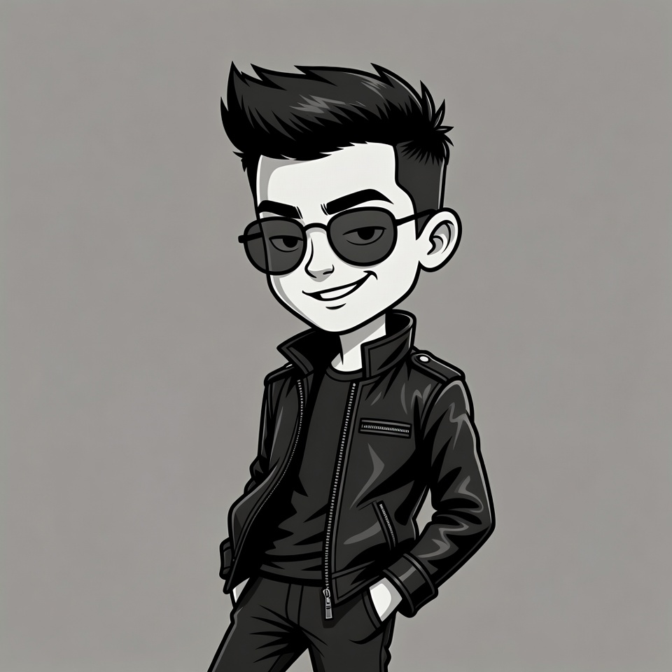 A cartoon illustration of a young boy with spiky hair and sunglasses stands confidently with hands in pockets. He wears a black leather jacket over dark clothing and smiles broadly. The image is rendered in black and white line art on a gray background.