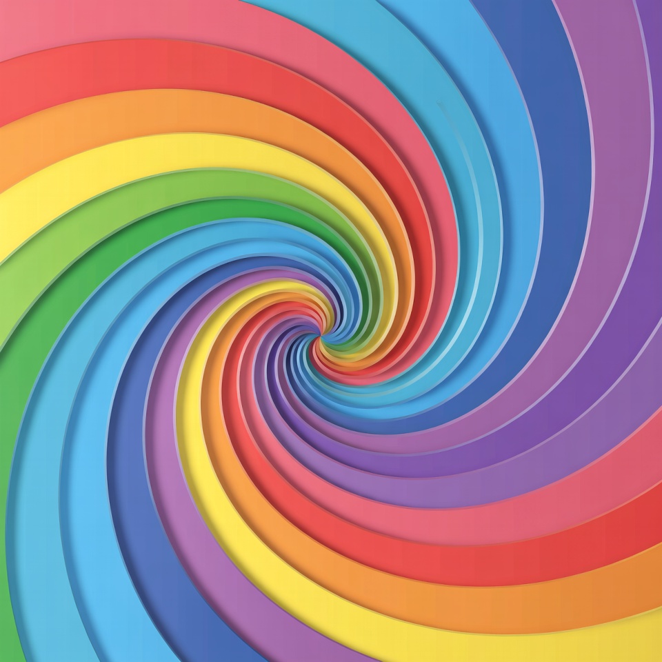 A vibrant digital illustration features a spiral pattern made of smooth, curved bands in rainbow colors. The design swirls inward from the edges toward a central point against a solid background. The glossy, 3D-like layers create depth and motion.