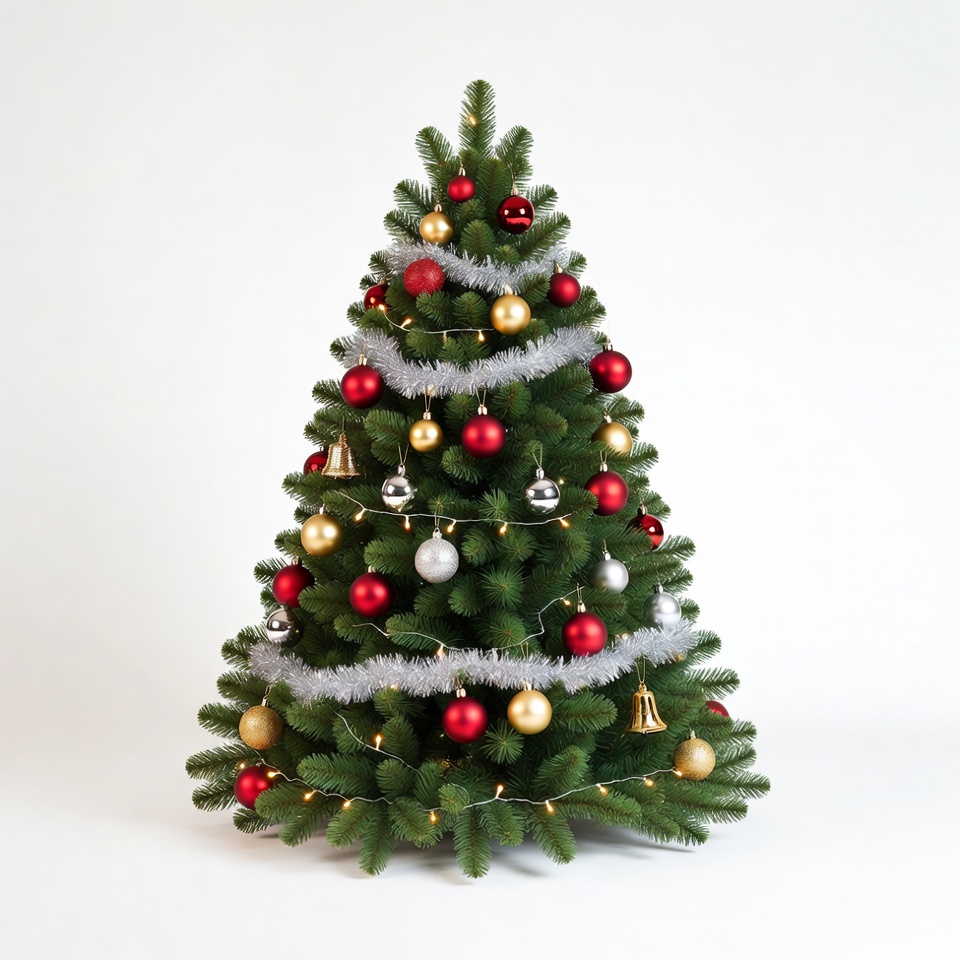 A tall evergreen Christmas tree stands on a white background, fully decorated with red, gold, and silver ornaments. It features shimmering tinsel garlands wrapped around its branches and small bells hanging among the balls. White lights illuminate the tree, highlighting the festive decorations.
