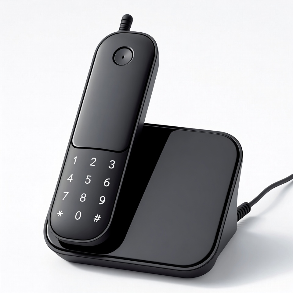 black, black phone, charging base, home phone, isolated background, keypad, numeric buttons, phone cradle, phone handset, retro phone, telephone, white background, wireless phone, cordless phone
