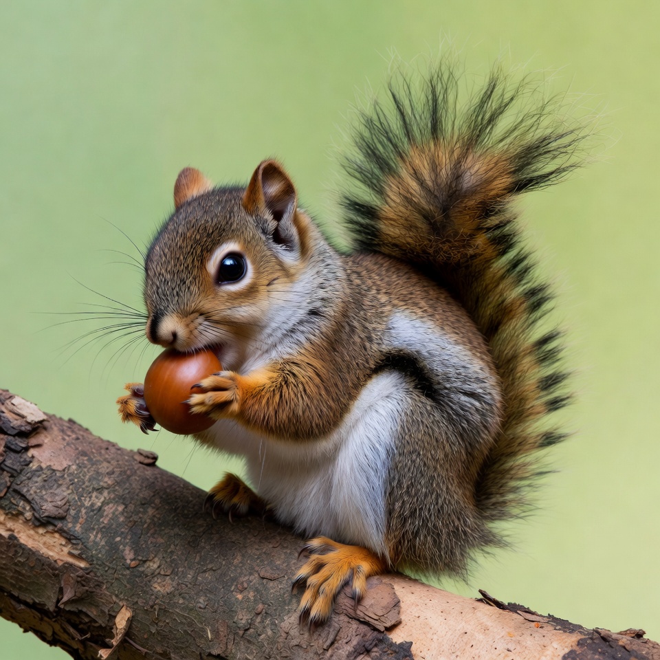 acorn, animal, baby squirrel, bushy tail, cute squirrel, eating acorn, fur, green background, isolated background, nature, paws, rodent, tree branch, whiskers, wildlife, squirrel