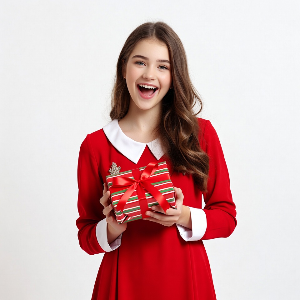 Christmas gift, White, brooch, brown hair, cheerful girl, female, gift holding, happy, holiday gift, isolated background, long hair, present, red dress, red gift box, ribbon bow, smiling, wavy hair, white collar, young girl, girl