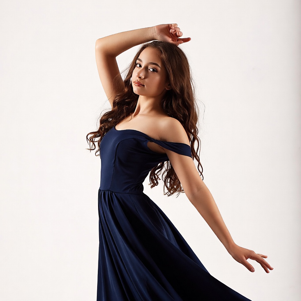 A young woman with long wavy brown hair poses gracefully on a white background. She wears a form-fitting navy blue off-shoulder dress with a flowing skirt. Her right arm is raised above her head and left arm extended, emphasizing a dynamic stance.