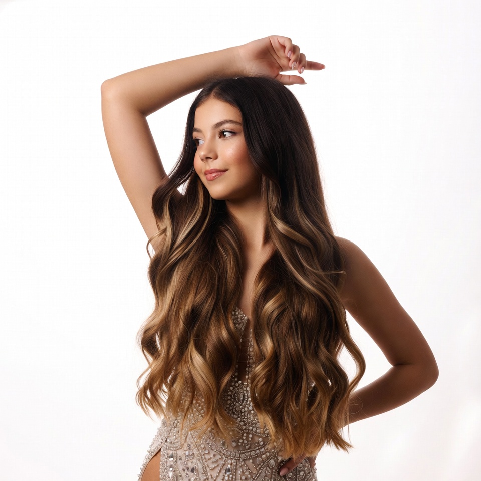 A young woman with long wavy balayage hair stands against a white background, posing with her right hand raised to her head and fingers extended. She wears a sparkling beaded dress that accentuates her figure and smiles softly to the side. Her dark eyes and tanned skin are highlighted in the close-up portrait.