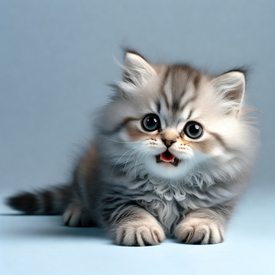 A fluffy gray tabby kitten sits on a light blue background with its front paws extended forward. The kitten has large round yellow eyes, pink mouth open, and striped fur with white accents. Its tail is curled behind it.