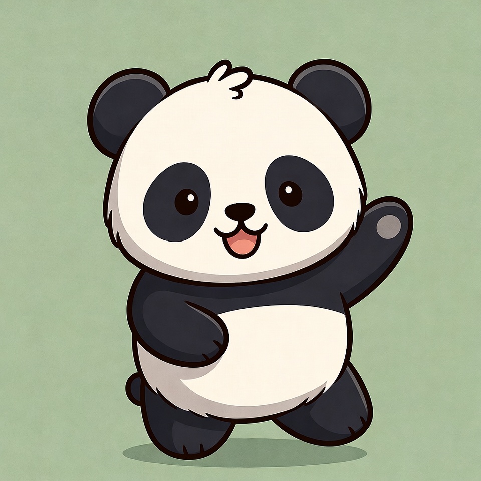 A cute cartoon panda with black and white fur stands on a light green background. It has large expressive eyes, a smiling mouth, and is happily waving one paw while the other paw is slightly raised. The illustration features bold outlines and a chibi style.