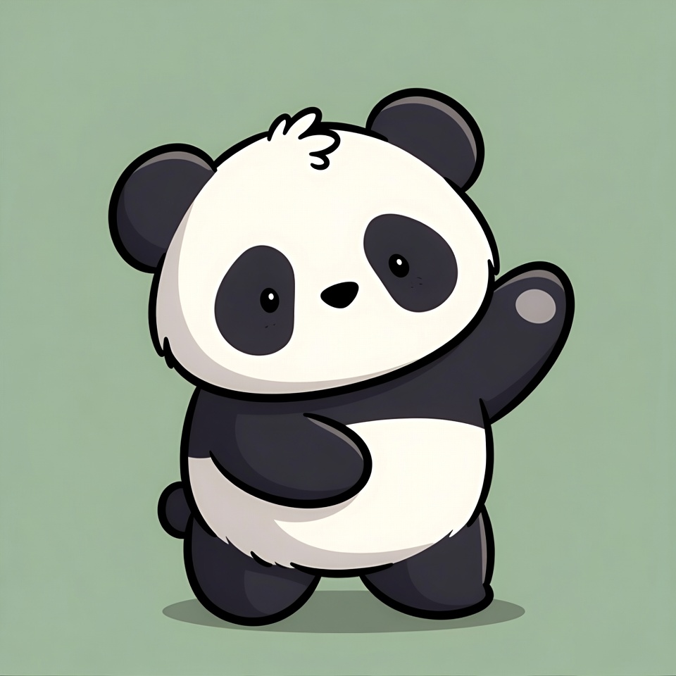 A chibi-style cartoon panda with black and white fur stands on a light green background. It has large expressive eyes, fluffy ears, and a cheerful expression while raising one paw in a waving gesture. The illustration features bold outlines and a simple isolated background.