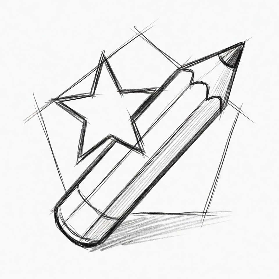 A hand-drawn sketch features a detailed pencil lying diagonally with a prominent white star positioned above it. The illustration uses bold outlines and subtle shading for a three-dimensional effect. Crosshatch lines and white space emphasize the isolated background.