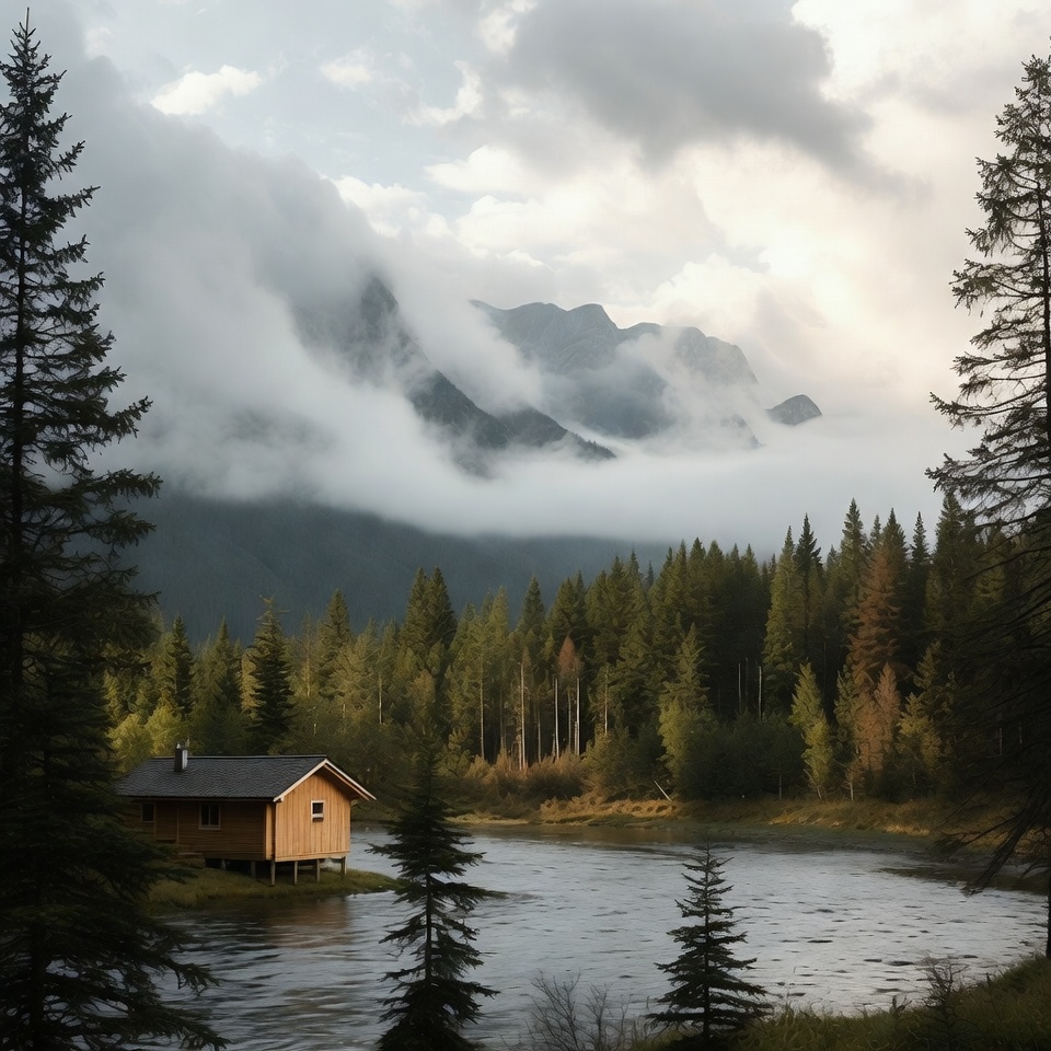 A small wooden cabin sits on stilts over a calm river surrounded by dense pine trees. Misty fog clings to the rugged mountain peaks in the background under a cloudy sky. Evergreen forests and a few autumn-colored trees frame the serene landscape.