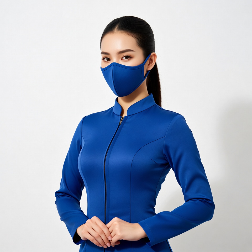 A young Asian woman with straight black hair in a ponytail stands against a white background. She wears a blue face mask and a form-fitting blue zip-up uniform with a mandarin collar. Her hands are clasped in front of her in a poised stance.