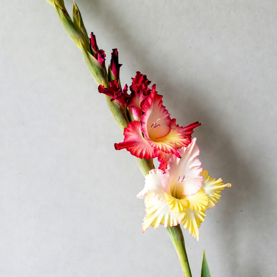 blooms, closeup, floral, flower stem, flowers, gladiolus flowers, gray background, green stem, isolated, petals, pink flowers, plant, red flowers, ruffled petals, tall stem, vibrant colors, white flowers, yellow flowers, gladiolus