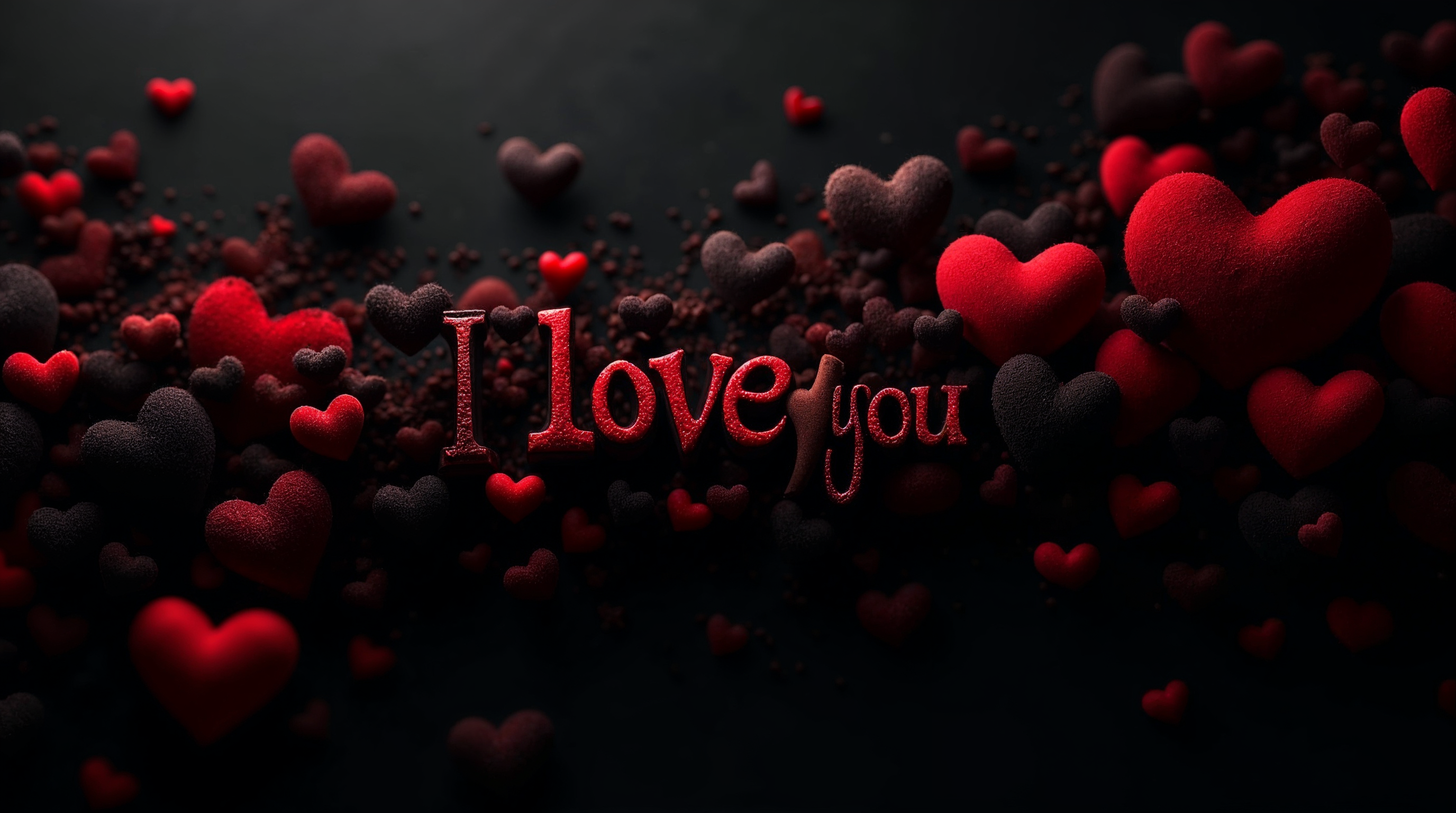 3D hearts, affection graphic, banner hearts, black background, dark hearts, digital art, glossy hearts, heart cluster, heart explosion, heart scatter, hearts background, isolated background, love graphic, love message, love symbol, love text, love wallpaper, red hearts, red text, romantic design, romantic hearts, valentine day, valentine hearts, I love you