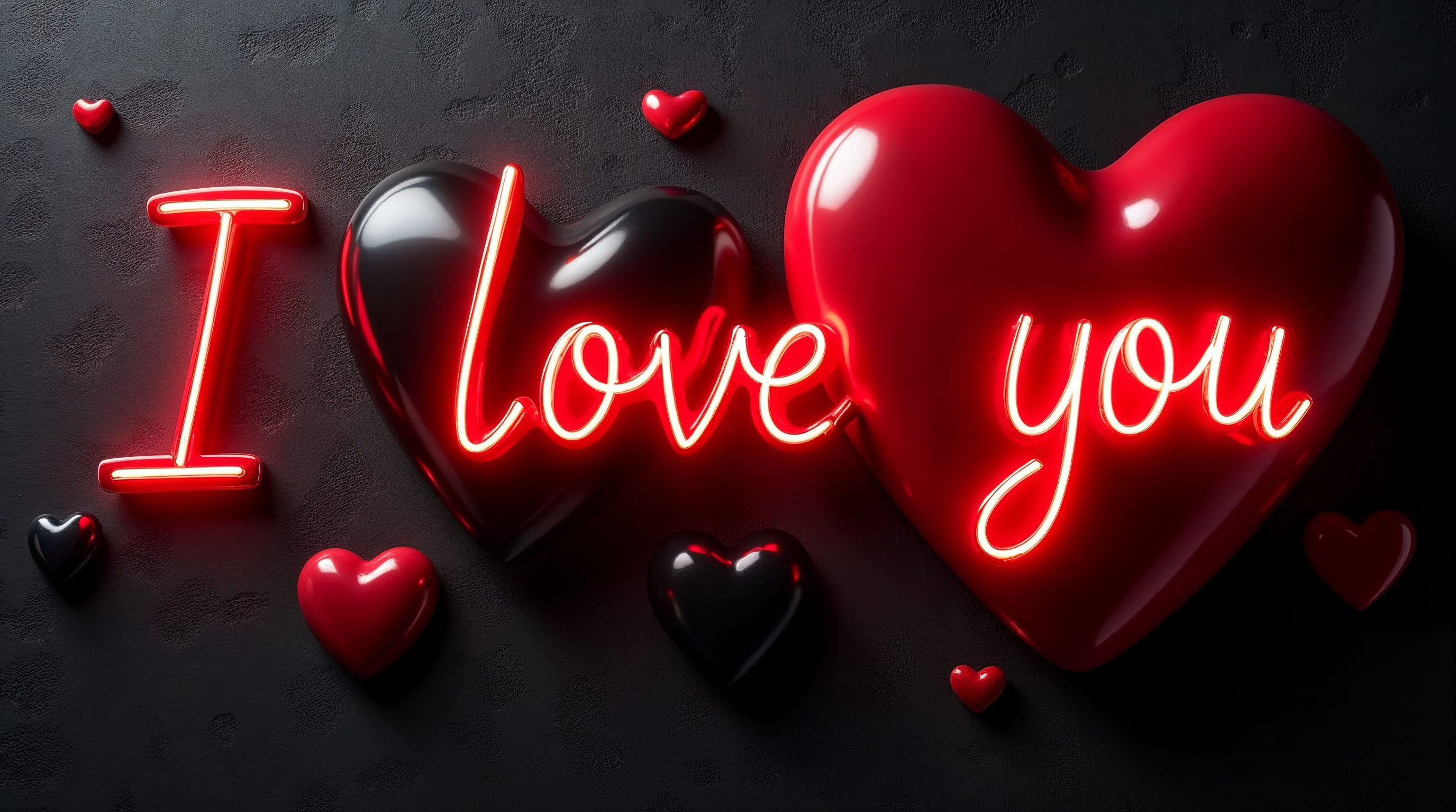 3D hearts, I love you, Valentine's Day, affection, black background, black hearts, couple love, dark background, emotional text, floating hearts, glossy hearts, glowing text, heart decoration, heart shapes, holiday graphic, illuminated text, love message, love symbol, pink neon, red hearts, red neon, romance, romantic sign, textured wall, vibrant glow, neon sign