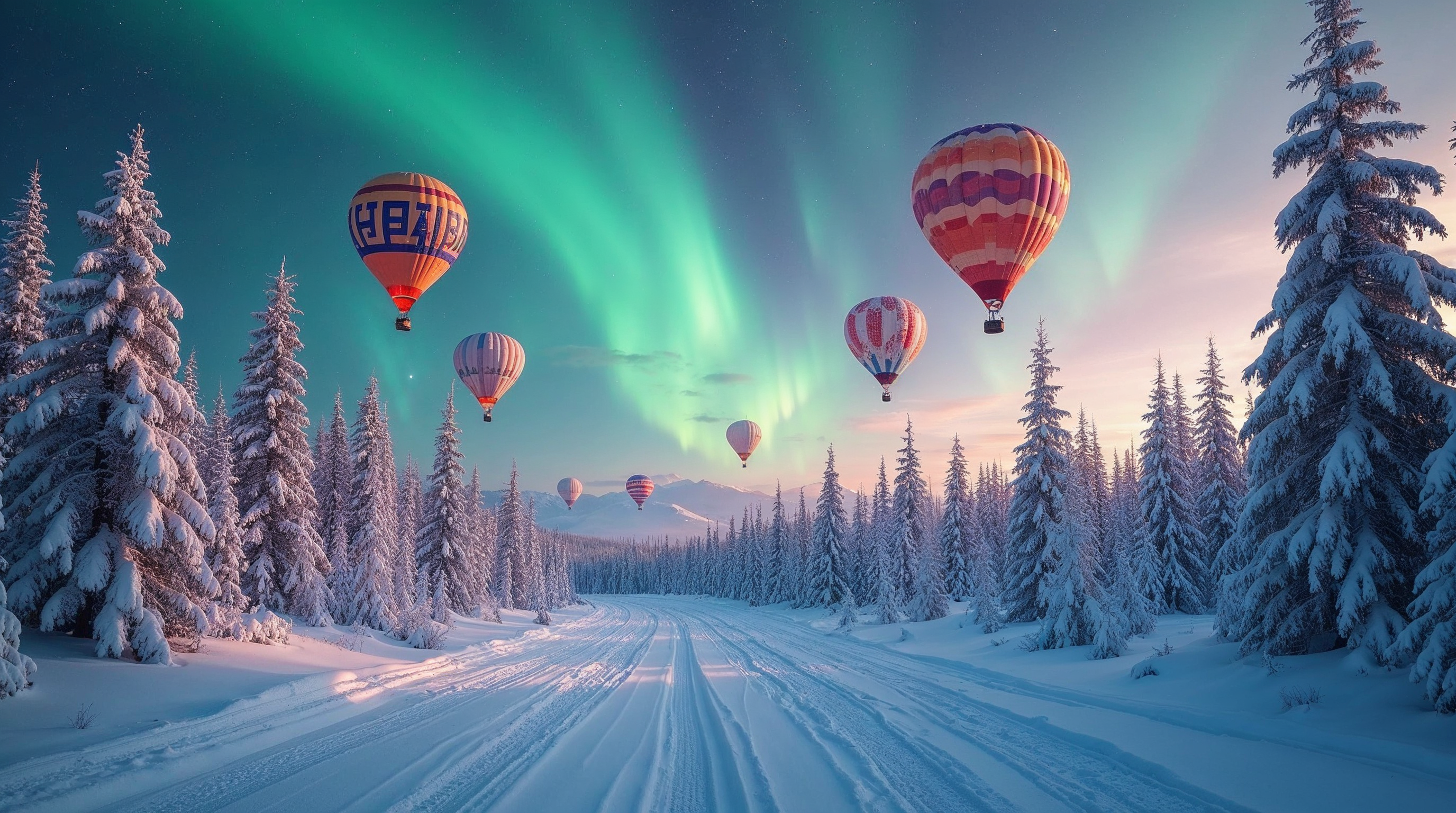 Colorful hot air balloons float above a snowy path lined with evergreen trees under a vibrant aurora borealis sky. The scene features a winter landscape with snow-covered ground and distant mountains at dusk. Balloons in red, orange, and striped patterns drift peacefully in the crisp air.