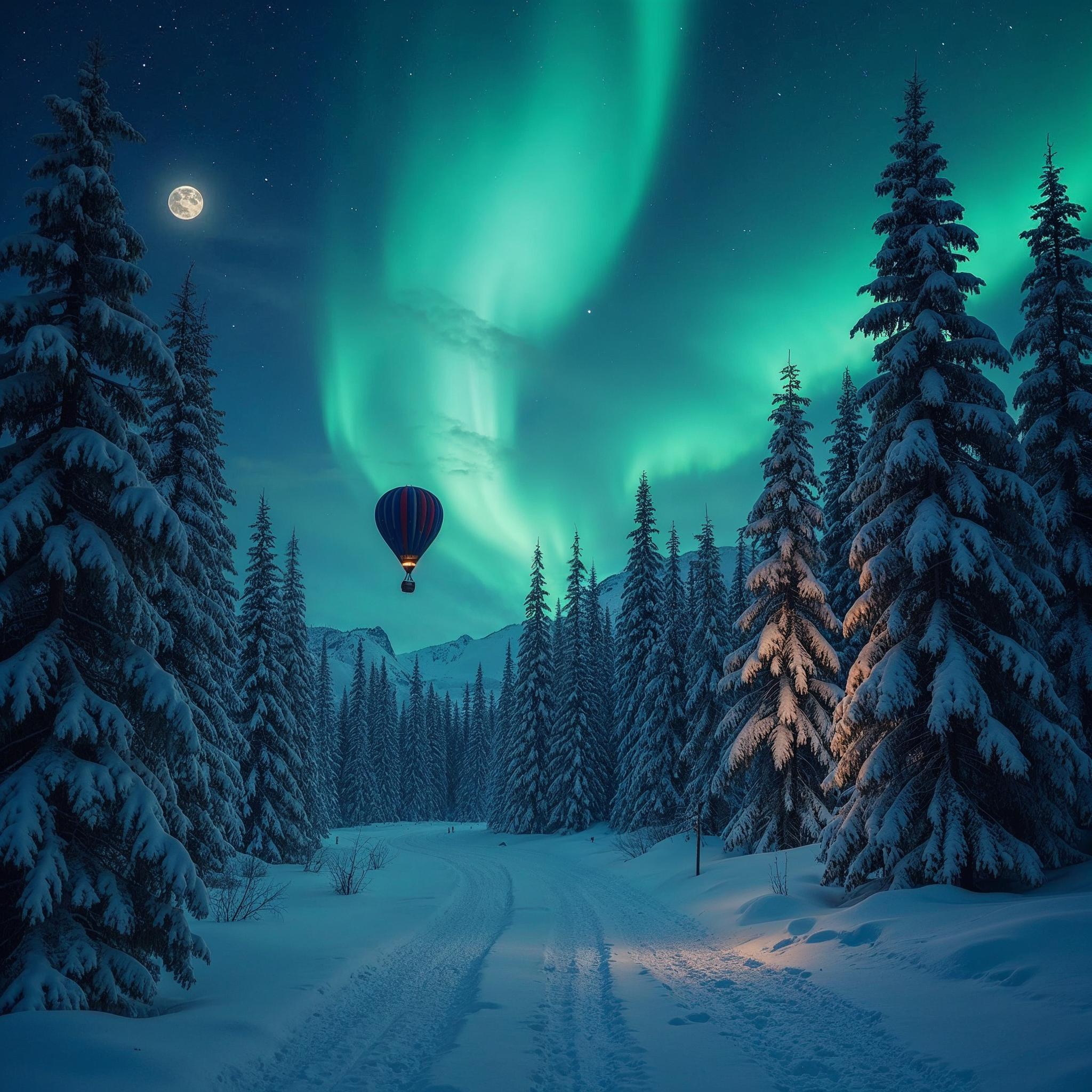 aurora borealis, dark sky, fir trees, forest, full moon, green aurora, hot air balloon, mountains, night sky, pine trees, snow, snowy path, wilderness, winter landscape, northern lights