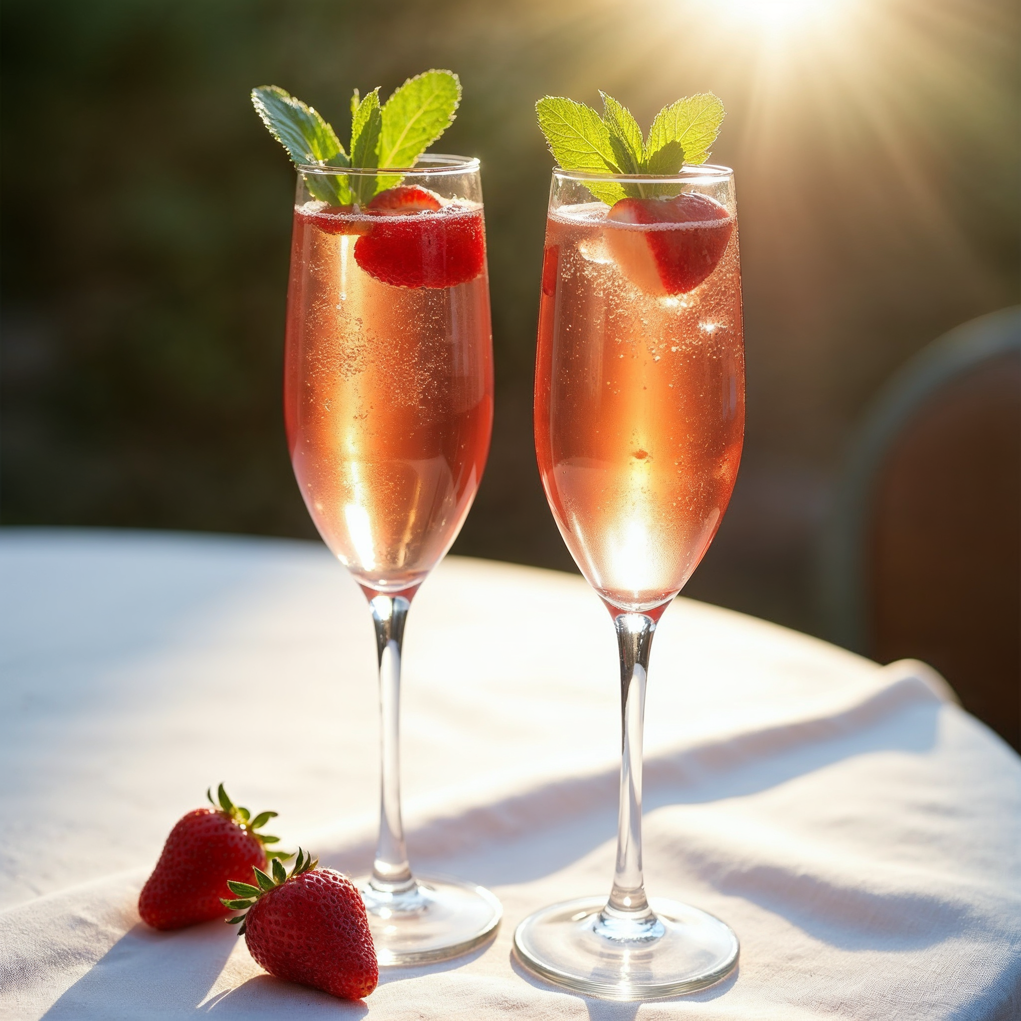 beverage, bubbly drink, celebration drink, cocktail, elegant glasses, floating strawberries, fresh mint, fruit garnish, golden hour, mint garnish, outdoor setting, pink drink, refreshing beverage, rosé champagne, sparkling wine, strawberries, strawberry champagne, summer drink, sunset light, table setting, tall glasses, white tablecloth, champagne flutes