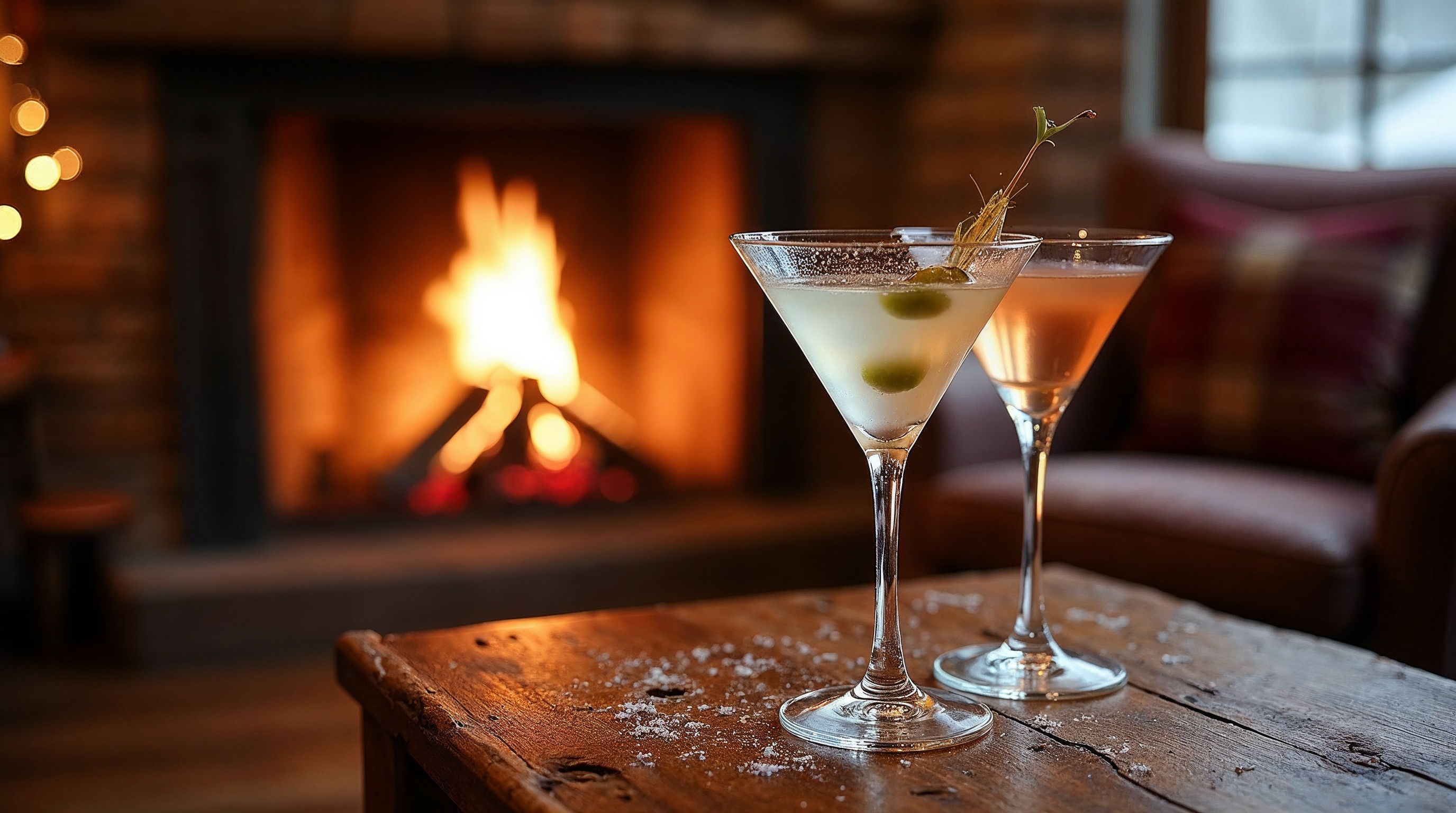 bar drinks, citrus twist, classic martini, cocktails, cosmopolitan, cozy interior, dirty martini, drinks on table, elegant cocktails, fire, fireplace, flames, holiday drinks, leather armchair, martini, olive garnish, olives, plaid cushions, rustic table, snowy window, string lights, warm lighting, winter scene, wooden table, martini glasses