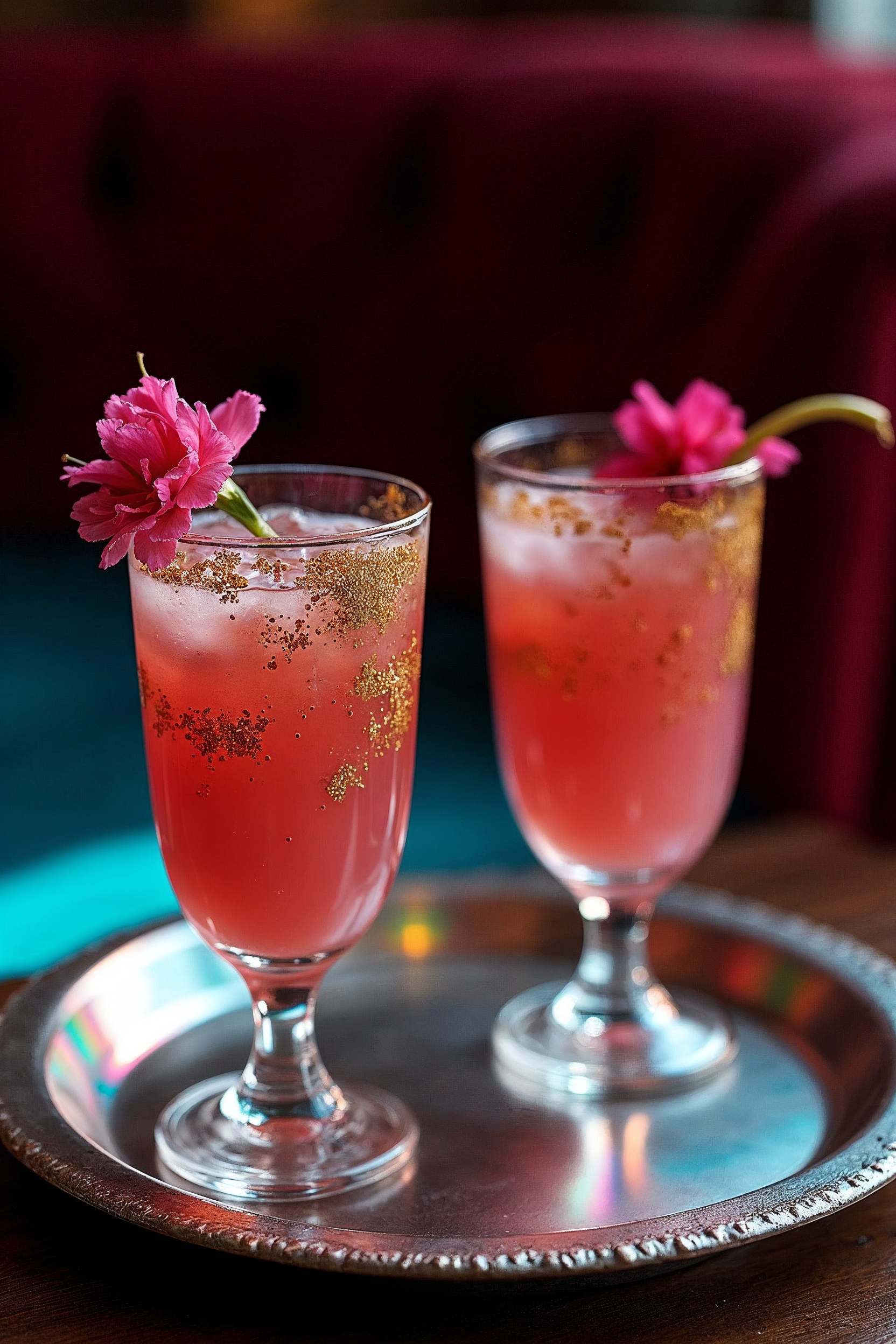 Two tall glasses of pink cocktails garnished with pink flowers and gold flecks sit on a shiny silver tray. The drinks feature ice, green stems, and a vibrant red hue in elegant stemware. A blurred red velvet background adds contrast.
