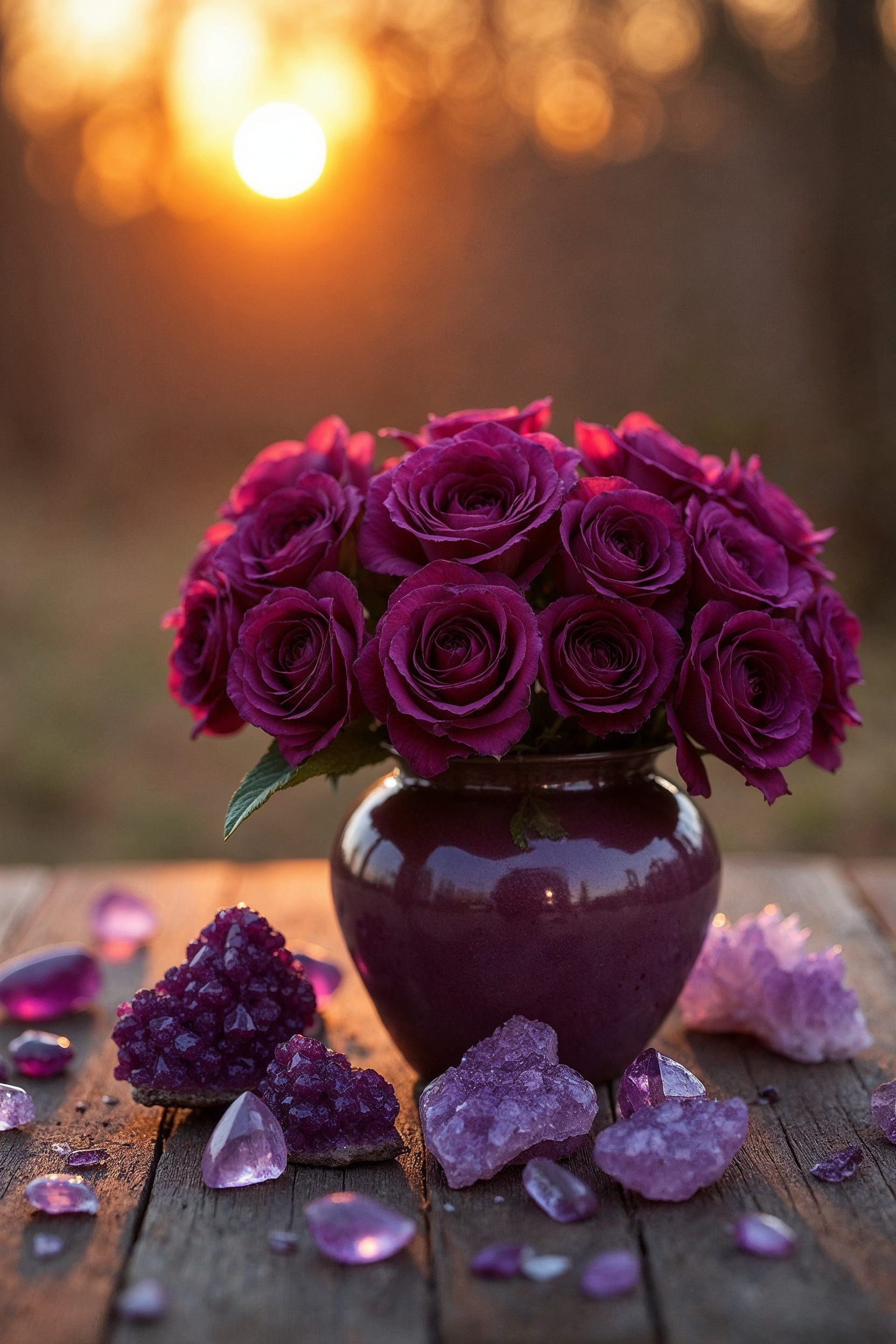 A bouquet of vibrant purple roses sits in a matching purple vase on a wooden table. Surrounding the vase are scattered purple amethyst crystals and quartz points. The scene is set against a blurred sunset background with warm orange hues.