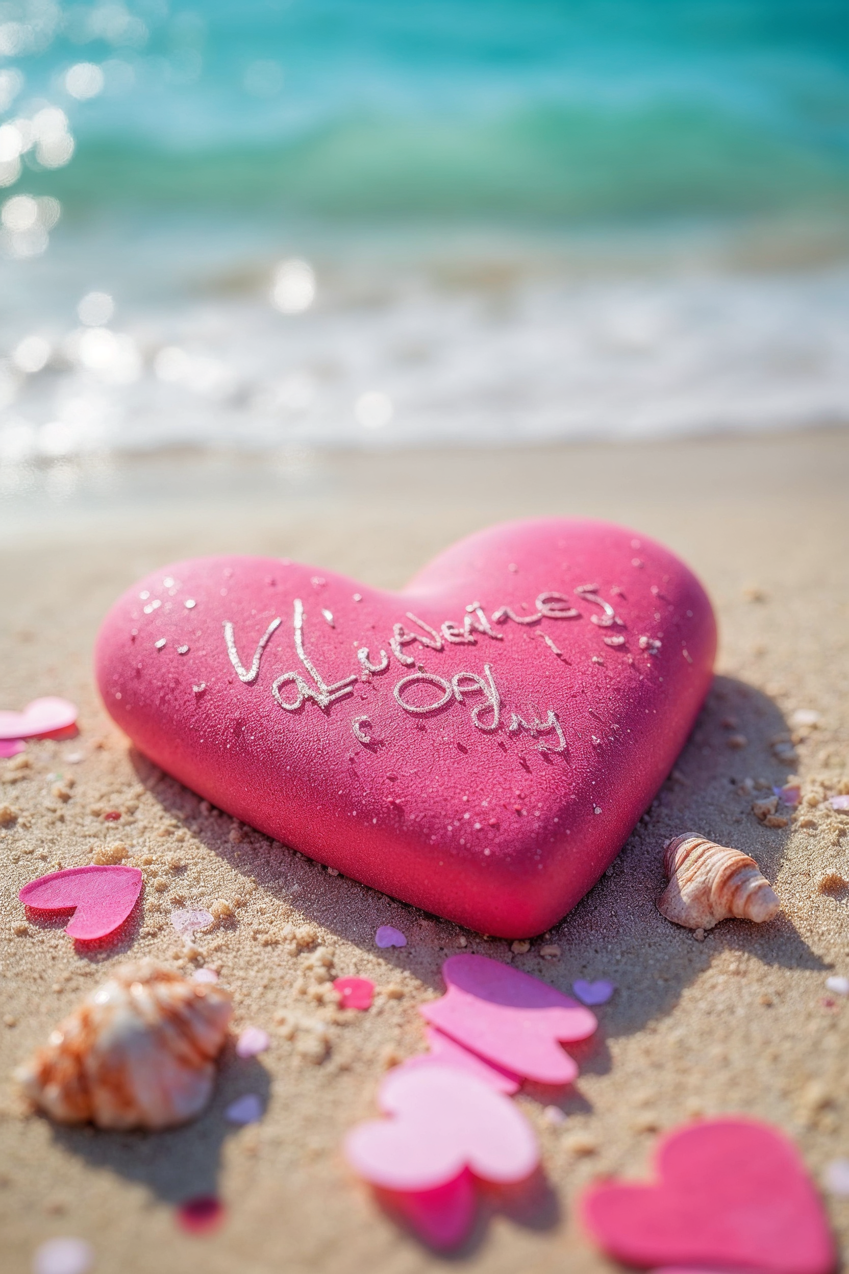 A large pink heart-shaped rock with 'Valentine's Day' written in white lies on sandy beach by turquoise ocean waves. Surrounding it are smaller pink heart cutouts and seashells. The scene features a bokeh ocean background with gentle waves.