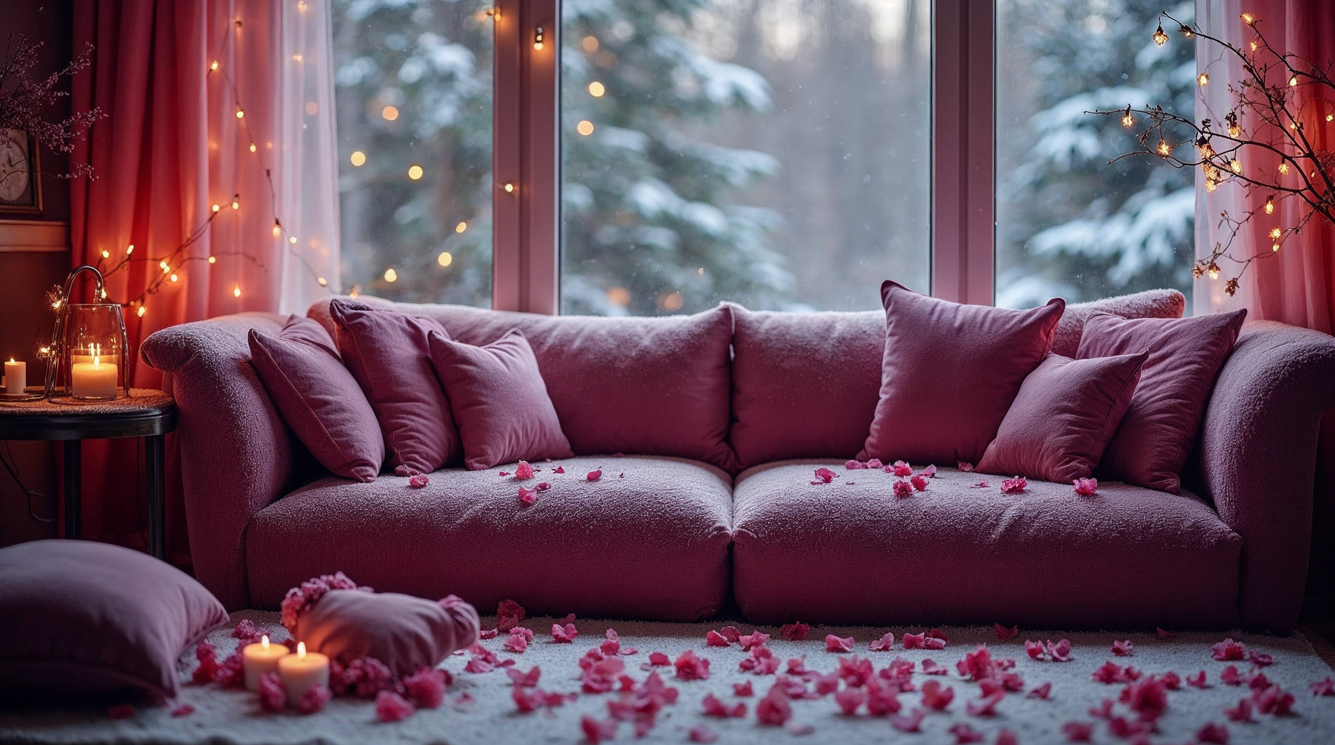branch decor, candles, clock, cozy room, fairy lights, floor petals, holiday vibe, pink curtains, pink cushions, plush pillows, romantic interior, rose petals, scattered petals, side table, snow outside, snow-covered trees, snowy window, twilight sky, velvet couch, warm lighting, window view, winter scene, pink sofa