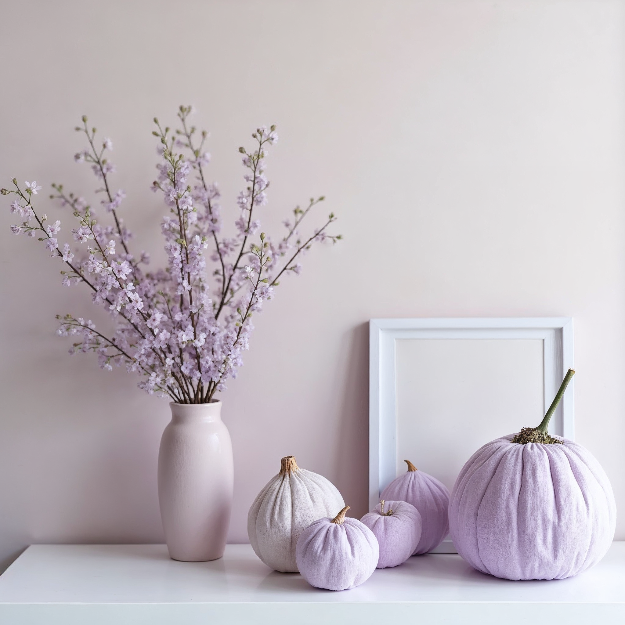 Several small purple fabric pumpkins sit on a white table next to a tall vase of delicate purple lilac branches. A white picture frame with a blank interior leans against the vase. The setup is arranged on a soft pink background.