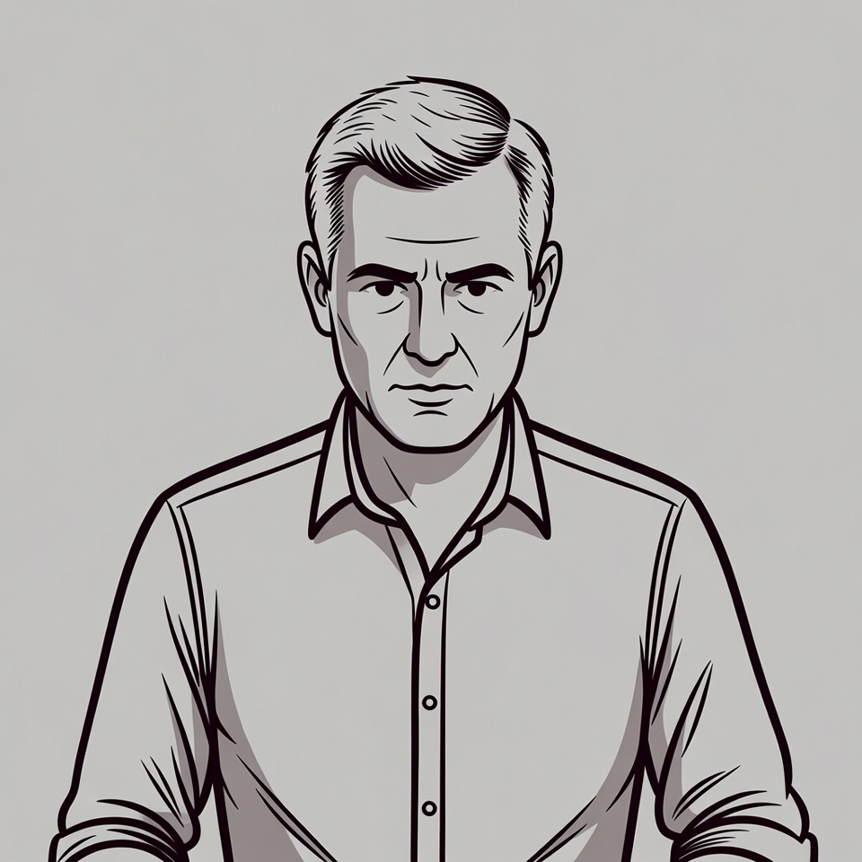 A line art illustration of a middle-aged man with short combed hair and a serious expression faces forward. He wears a collared white dress shirt with rolled sleeves. The vector drawing is set against a plain gray background.