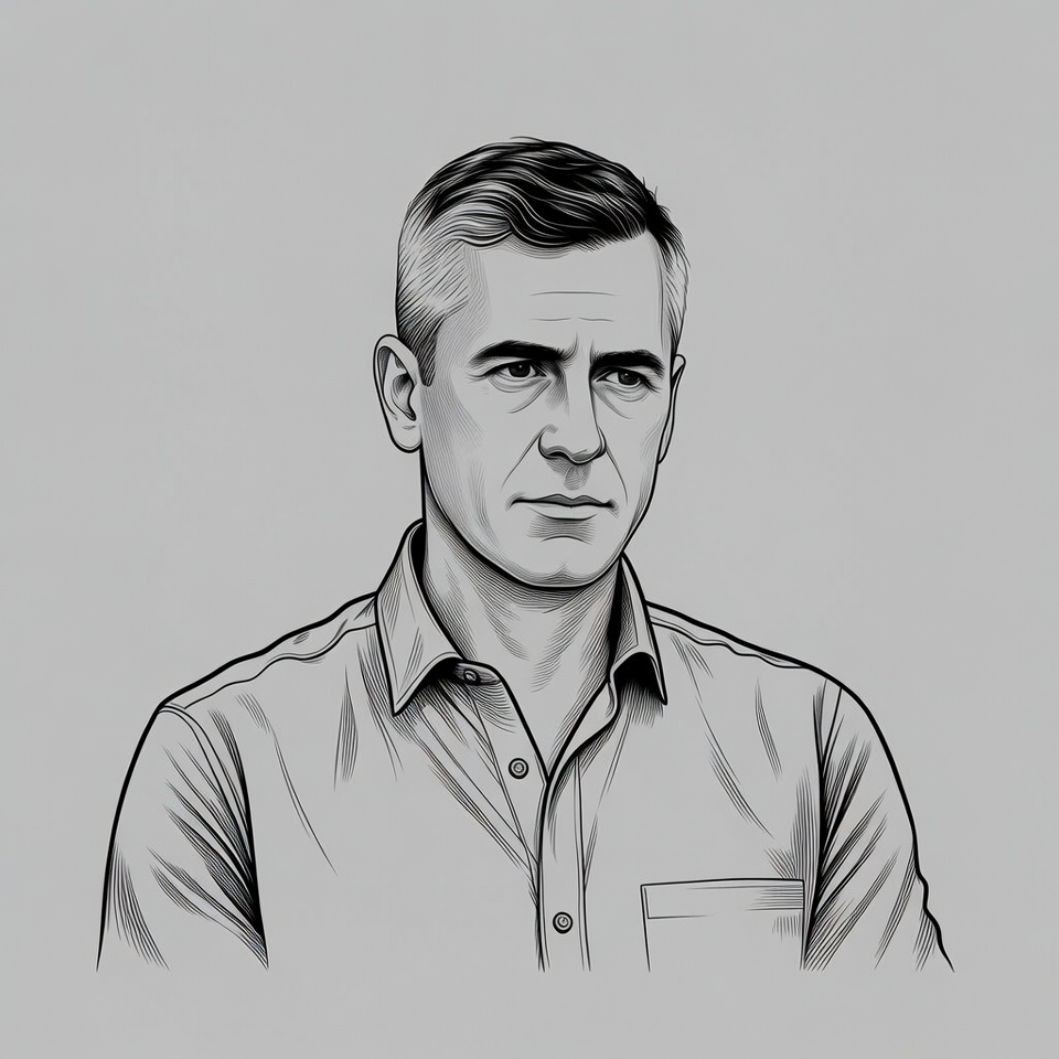 A detailed black and white illustration of a middle-aged man with short side-parted hair and a serious expression. He wears a collared button-up shirt with the top button undone. The portrait is set against a plain gray background.