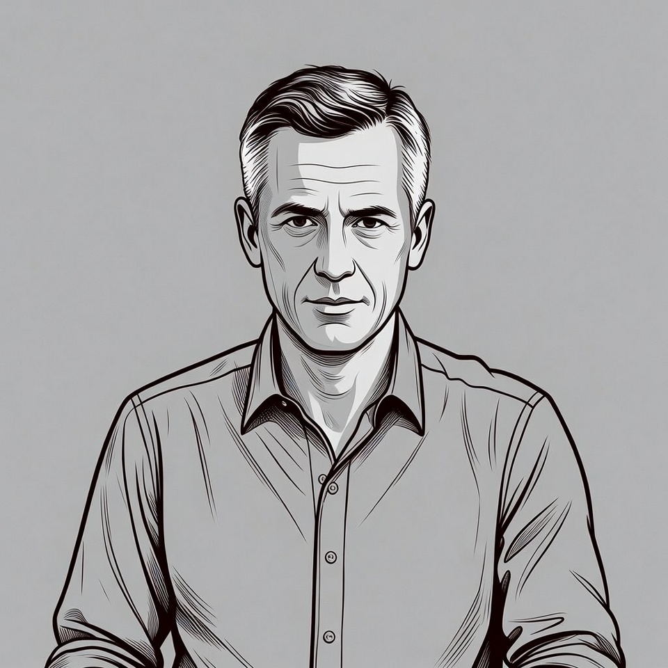 A line art illustration of a middle-aged man with short graying hair and a serious expression faces forward. He wears a collared shirt with the top buttons undone. The portrait is set against a plain gray background.