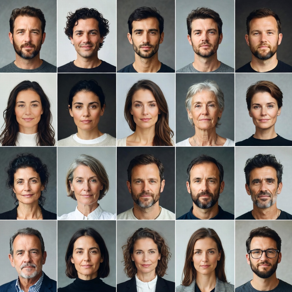 A grid of 24 close-up headshot portraits features men and women of various ages and ethnicities. They wear professional attire like collared shirts and blazers against neutral backgrounds. Expressions are neutral to smiling, showcasing diverse hairstyles from short to long and graying.