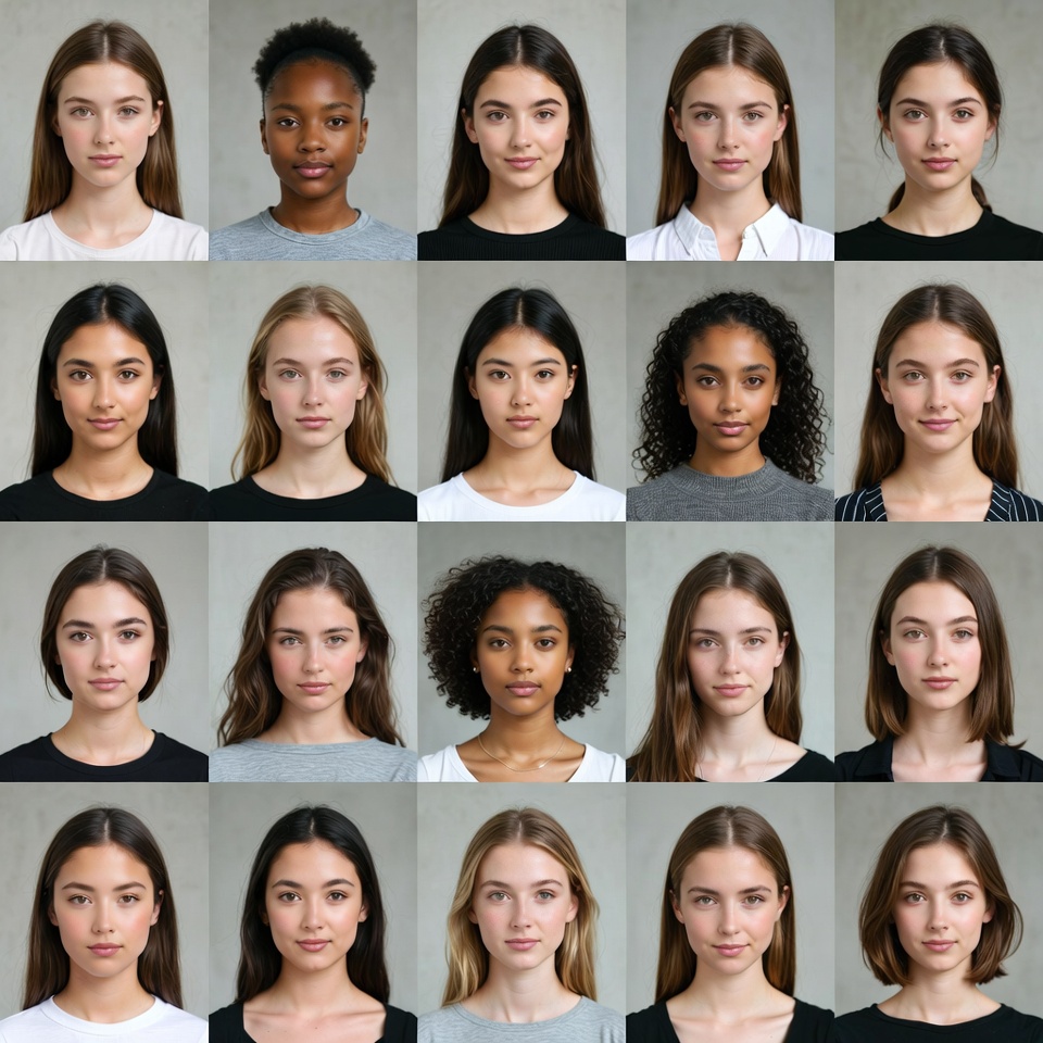 A grid of 25 close-up headshots features young women of various ethnicities with neutral expressions. They have different hairstyles including straight, wavy, and curly hair, and wear simple tops in white, black, and gray. The portraits are arranged in five rows of five against plain gray backgrounds.