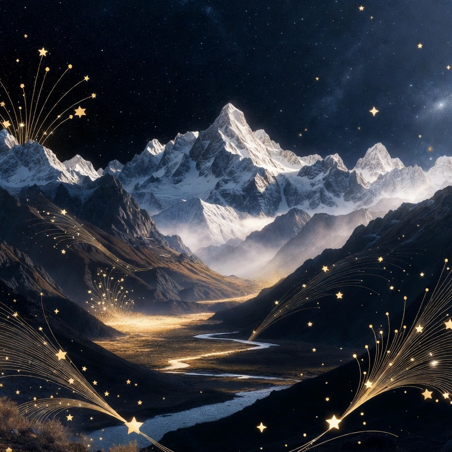 A majestic snowy mountain peak towers over a valley with a winding golden river under a starry night sky. Fireworks and sparkling stars illuminate the rugged terrain and misty surroundings. The scene features dramatic lighting and ethereal glows on the snow-covered peaks.
