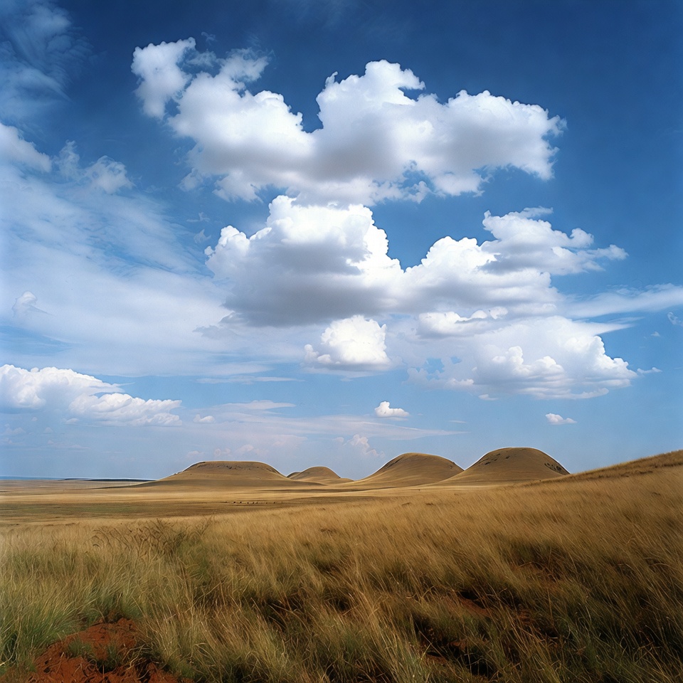Fluffy white clouds fill the bright blue sky above rolling golden hills covered in tall grass. Several dome-shaped buttes rise from the expansive yellowish grassland. The foreground features patches of reddish soil amid the waving grass.